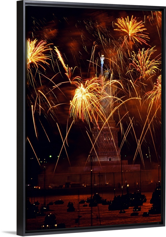 <p>Vertical, oversized photograph of fireworks exploding in front of the Statue of Liberty, as many boats watch in the waters below.</p>