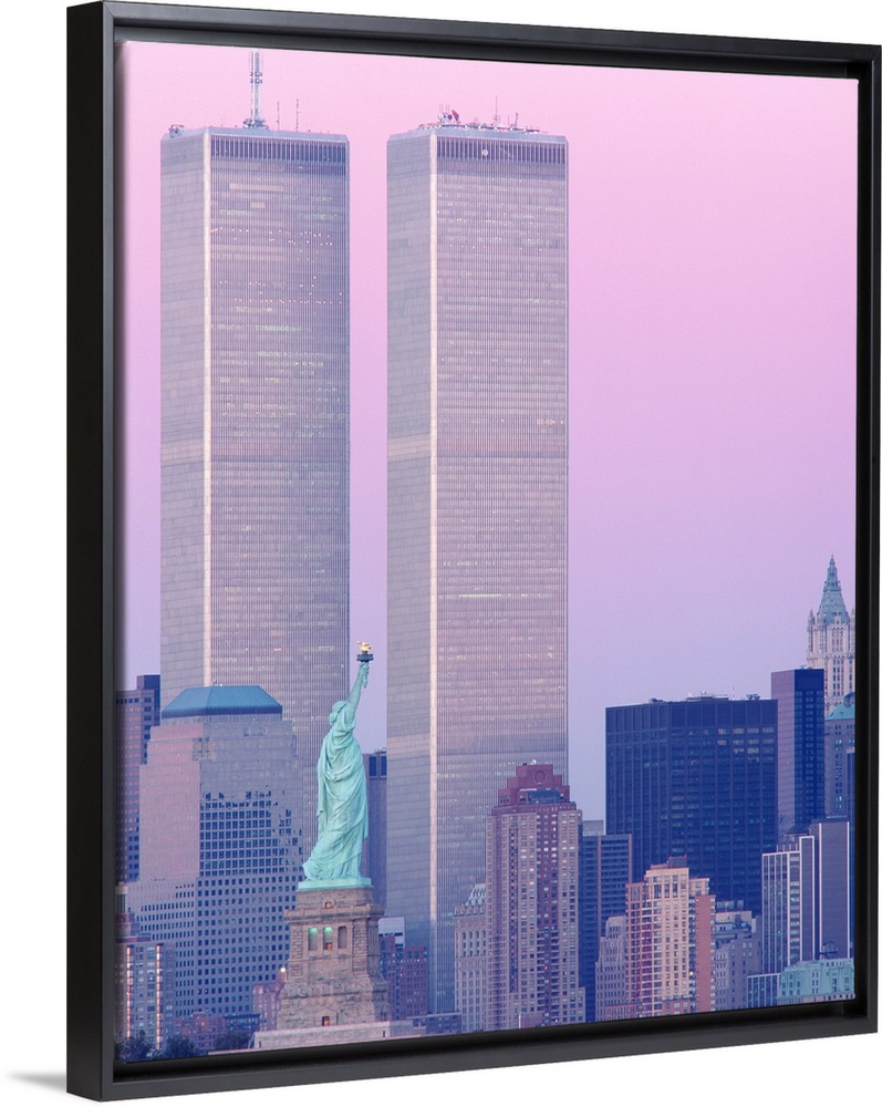 <p>Big, vertical photograph of New York City, including the Statue of Liberty and the World Trade Center.</p>