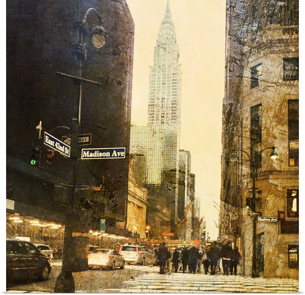 <p>Pedestrians and cars in New York City on a rainy day.</p>