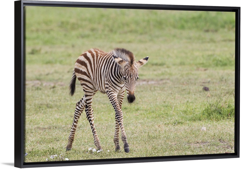 <p>Newborn zebra colt with long skinny legs looking at camera.</p>