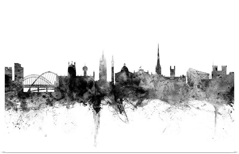 <p>Contemporary artwork of the Newcastle city skyline in black watercolor paint splashes.</p>