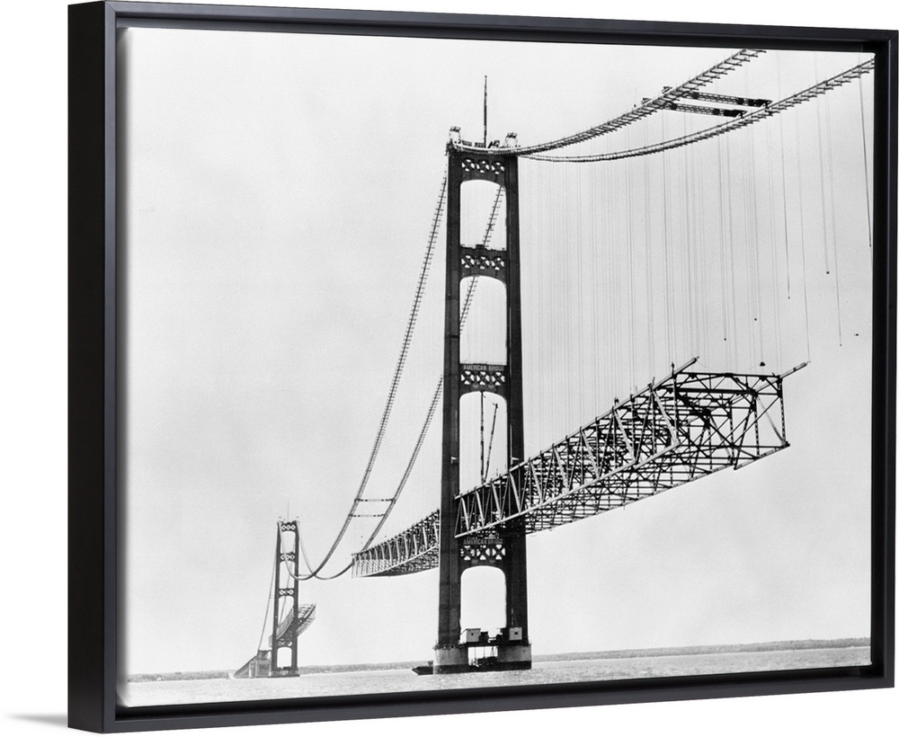 <p>St. Ignace, Michigan: Just A few More Feet. Only a few more feet to go and this stiffening truss unit will take its permanent place in the huge Mackinac Bridge. This phase of the work is expected to be completed during the latter part of this month--weather permitting, the suspended roadway will assume its final shape after all the stiffening trusses have been raised. At the bridge's center point motorists will see the beautiful straits area from an elevation of about 185 feet above the water.</p>