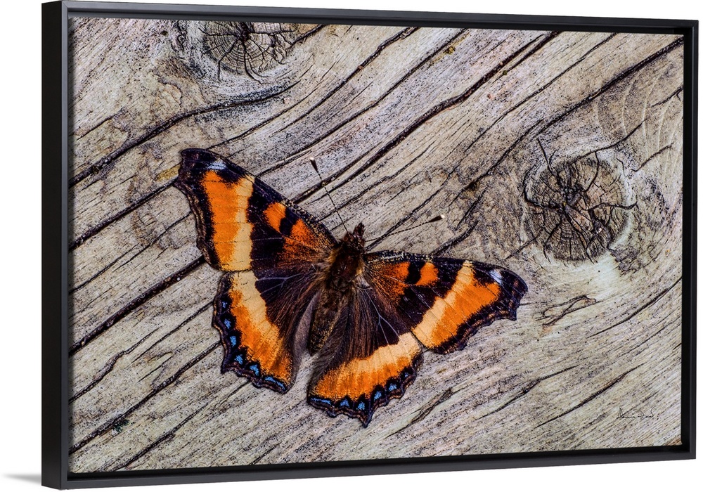 <p>Tortoise Shell Butterfly on weathered wood, Kleefeld, MB, Canada.</p>