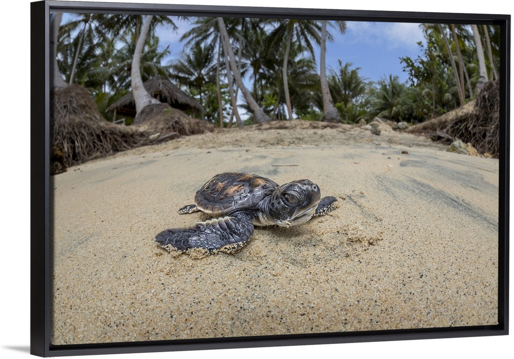 <p>Newly hatched baby green sea turtle (chelonia mydas), an endangered species, makes its way across the beach to the ocean off the island of yap, federated states of Micronesia.</p>