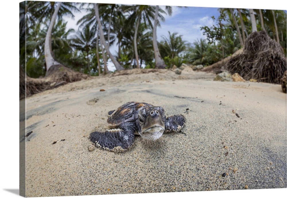 <p>Newly hatched baby Green sea turtle (Chelonia mydas), an endangered species, makes it's way across the beach to the ocean off the island of Yap, Micronesia; Yap, Federated States of Micronesia</p>