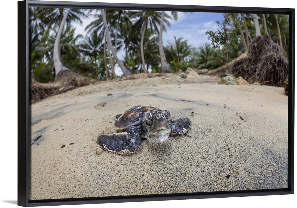 <p>Newly hatched baby Green sea turtle (Chelonia mydas), an endangered species, makes it's way across the beach to the ocean off the island of Yap, Micronesia; Yap, Federated States of Micronesia</p>