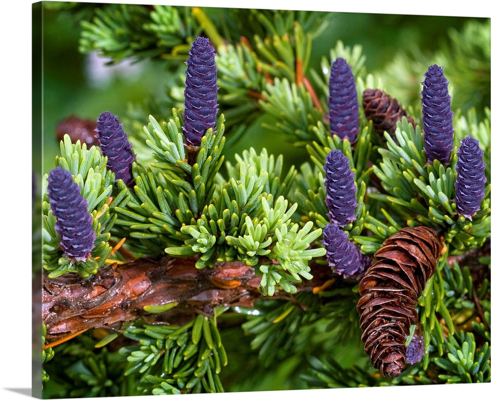 <p>Up close photograph of conifer tree's branch with different colored pine cones and needle-like leaves in Alaska.</p>