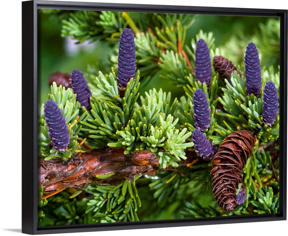 <p>Up close photograph of conifer tree's branch with different colored pine cones and needle-like leaves in Alaska.</p>