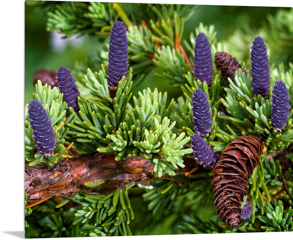<p>Up close photograph of conifer tree's branch with different colored pine cones and needle-like leaves in Alaska.</p>