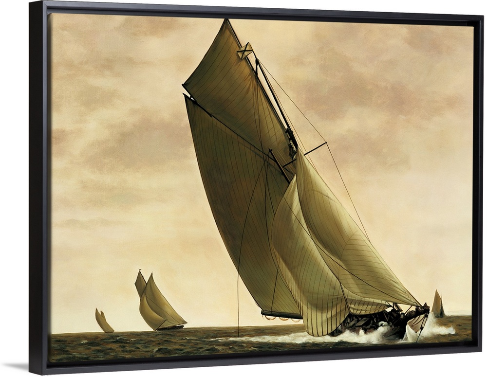 <p>Contemporary painting of sailboats in the middle of the ocean with the wind blowing to the left.</p>
