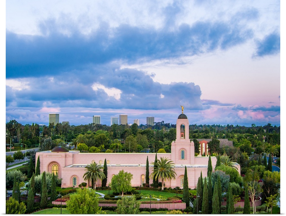 <p>The Newport Beach California Temple is surrounded by lush green grass, shrubs, and trees. It was dedicated in 2003 by Duane B. Gerrard and again in 2005 by Gordon B. Hinckley. It is one of two temples in the Los Angeles area. During the design and construction, the design of the building was modified to better please nearby residents and better fit the surrounding area. The outside of the building is a seashell hue to fit the coastal vibe of the Newport Beach area.</p>