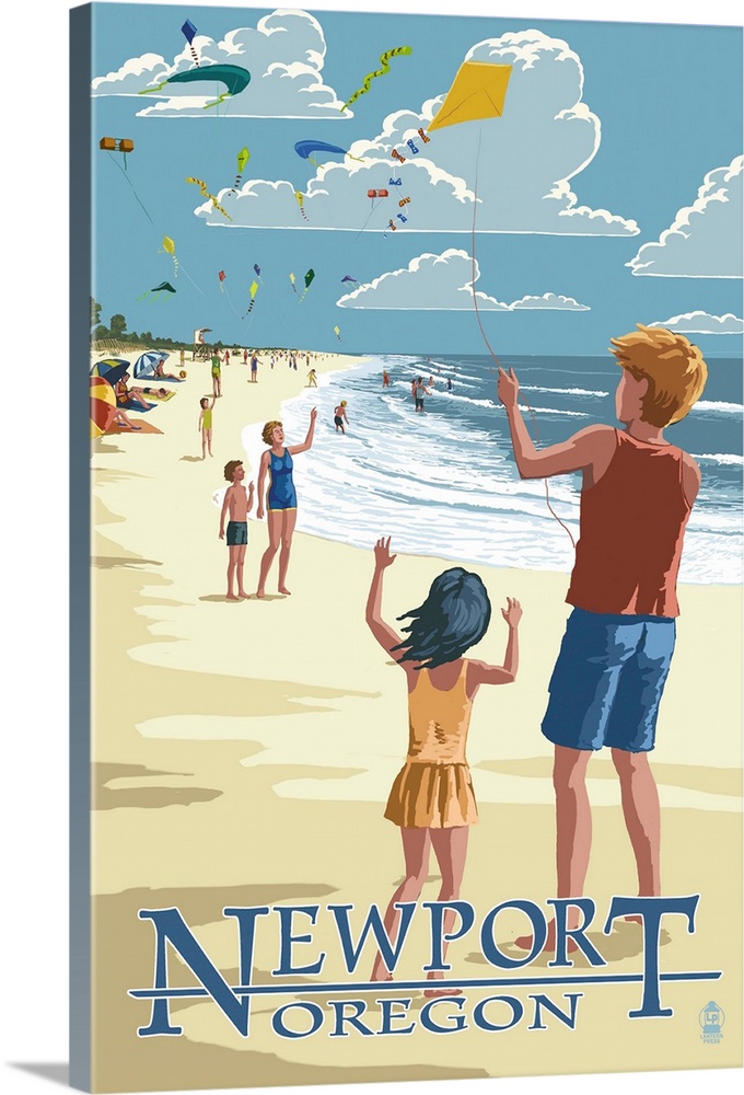 Newport, Oregon - Kite Flyers on Beach: Retro Travel Poster