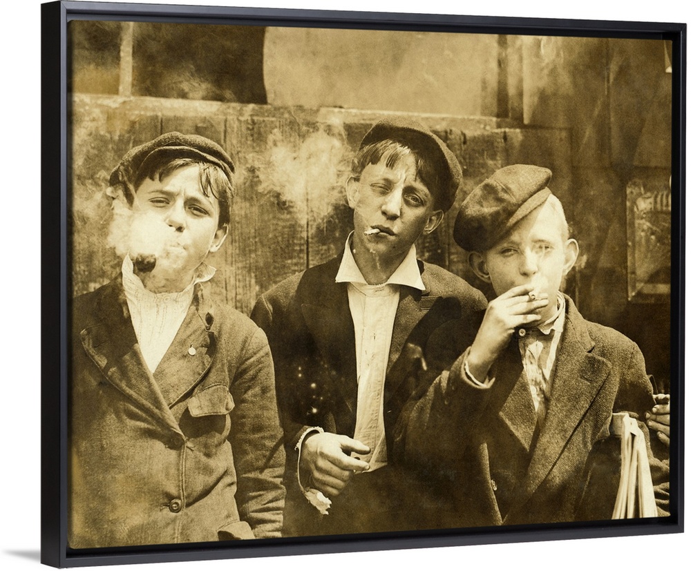 <p>Newspaper boys smoking. Three young 'newsies' or newspaper sellers smoking on a street ?aon a Monday morning in 1910. It was not uncommon for children who worked on the streets and in factories to smoke regularly. Some were aged as young as 10. Photographed in St. Louis, Missouri, USA on May 9th, 1910.</p>