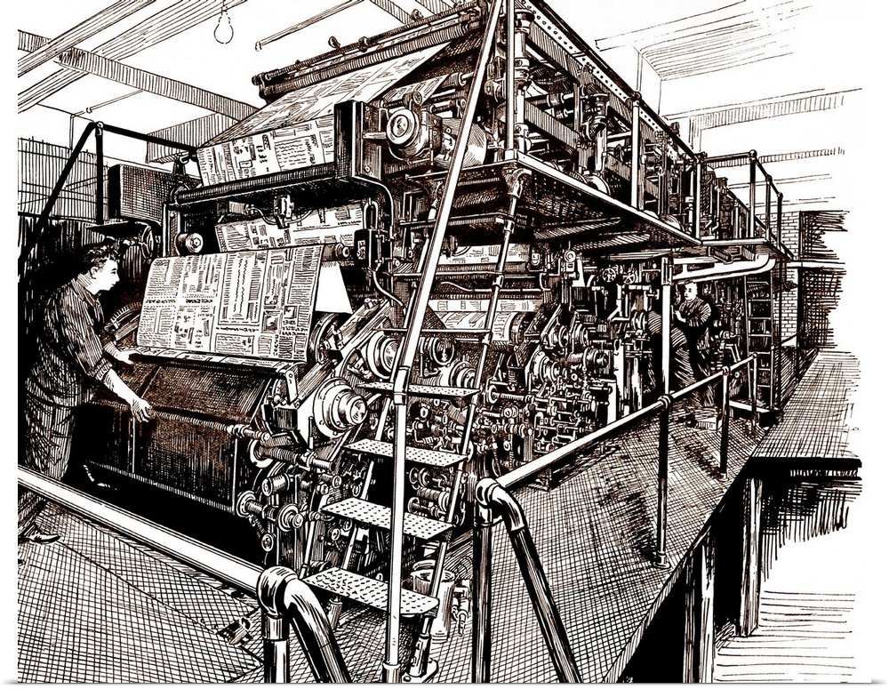 <p>Newspaper press. Historical artwork of a 1931 double cylinder rotary web perfecting press used to produce newspapers. This automatic machine could produce 50,000 copies in an hour, and used a reel of paper some eight kilometres long. This image was published in the Manchester Guardian (UK) on 18th June 1931.</p>
