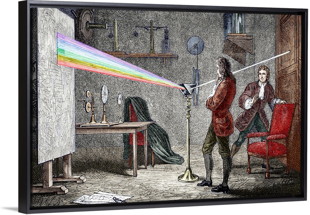 <p>Newton's optics. Coloured historical artwork of the English physicist and mathematician Isaac Newton (1642-1727) conducting his famous experiment on light. He is using a prism to refract a ray of light from a hole in the shutters over a window. A white surface (far left) showed that light splits into the different colours (spectrum) observed in rainbows. Newton failed to further split the colours, but later remixed the colours using a lens and prism. He carried out this experiment while at Cambridge University, but the results were not known until he published his book, Opticks, in 1704.</p>