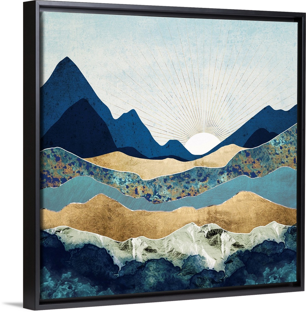 <p>Abstract landscape with mountains, blue, gold, sun and sky.</p>