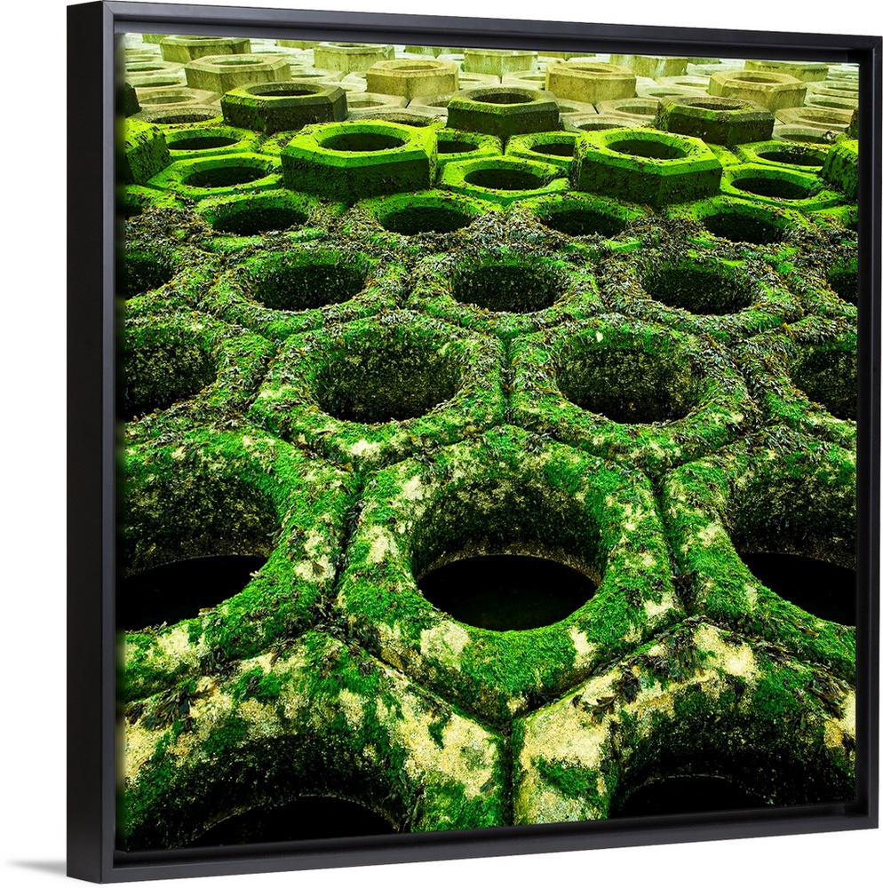 <p>A dramatic abstract of vivid green seaweed covered tessalated concrete coastal installations in hexagon patterns.</p>