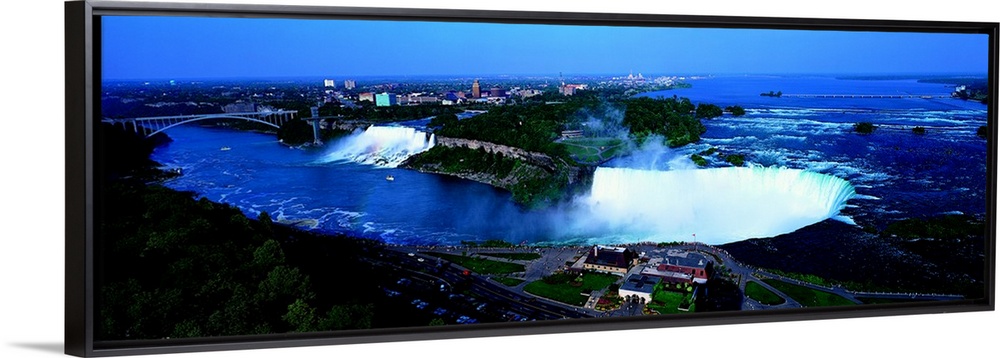<p>Aerial panoramic looking down at Niagra Falls and all the water spraying up in to the air with Ontario Canada in the background.</p>