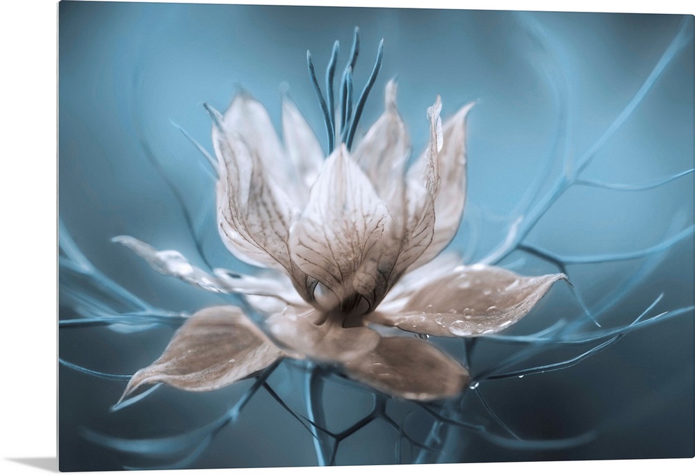 <p>A striking photograph of a white flower with blue branches streaming from it.</p>