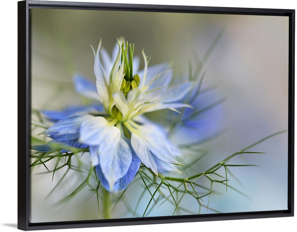 <p>Photograph of a beautiful blue and white flower with spiky green thorns below.</p>