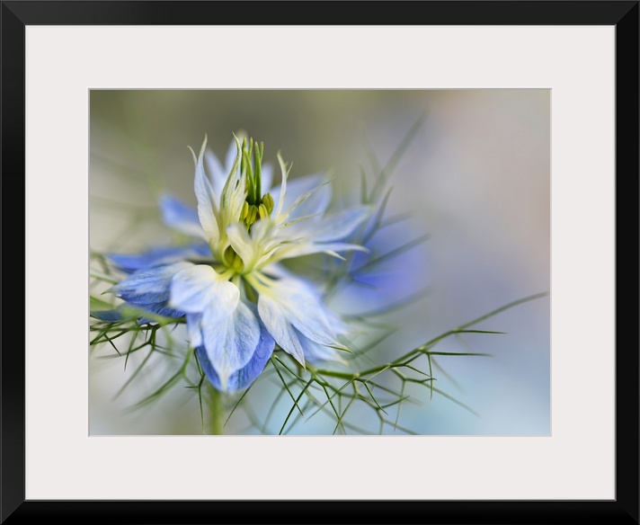 <p>Photograph of a beautiful blue and white flower with spiky green thorns below.</p>