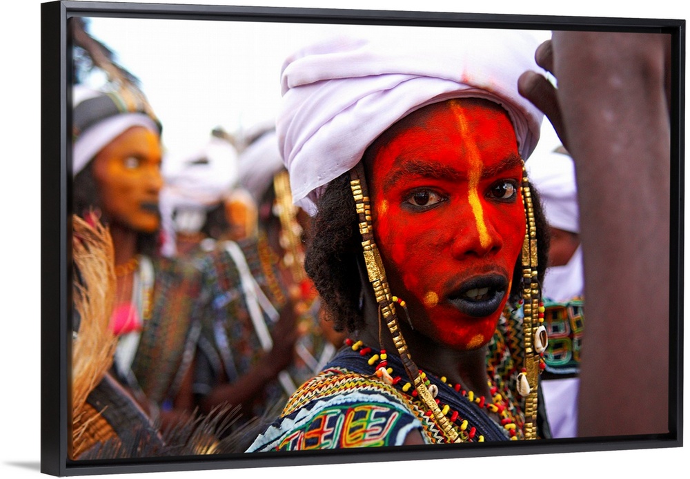 <p>Niger. Gerewol, assembl.....e g.....n.....rale des Peuls Wadabee d.......Afrique de l.......ouest. Peul Bororo. Chaque ann.....e pendant l'hivernage, les Peul Bororo se retrouvent apr.....s un an de transhumances pour c.....l.....brer le Gerewol. Profond.....ment animistes, la vie des Bororo est dict.....e par la beaut...... Ce culte atteint son apoth.....ose lors de cette f......te originale o..... seuls les hommes concourent. Apr.....s des heures de pr.....paration, ils se pr.....sentent en ligne, maquill.....s, par.....s de bijoux et de leur plus beaux atours. Ils chantent et dansent lentement ainsi, puis offrent aux femmes leurs sourires crisp.....s et leurs yeux .....carquill.....s afin de mettre en avant l'esth.....tique de leur visage. Les jeunes filles Bororo se m......lent ensuite aux danseurs et choisissent les plus beaux. // Niger. A Wodaabe-Bororo man with his face painted for the annual Gerewol male beauty contest. Gerewol, general reunion of West Africa for the Wadabee Peuls (Bororo peul). Every year the Peuls are meeting after one year of transhumance to celebrate the Gerewol.</p>