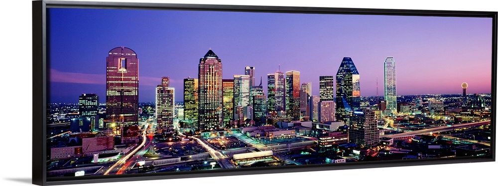 <p>Panoramic photograph displays the busy skyline of Dallas, Texas at night. The bright lights of the skyscrapers and cars can be seen for miles.</p>