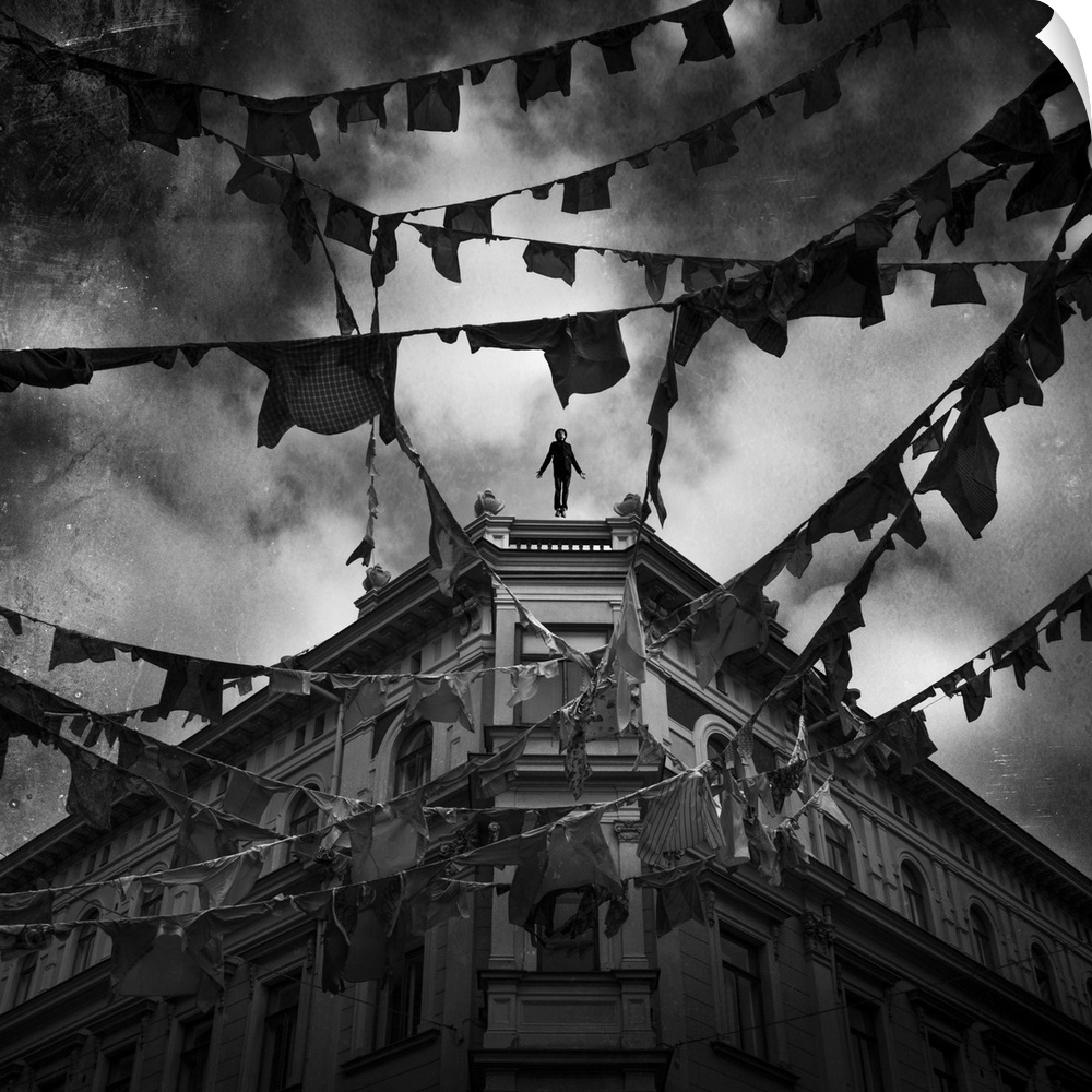 <p>Conceptual image of young adult male falling from tall building with clothes hung from bunting across street</p>