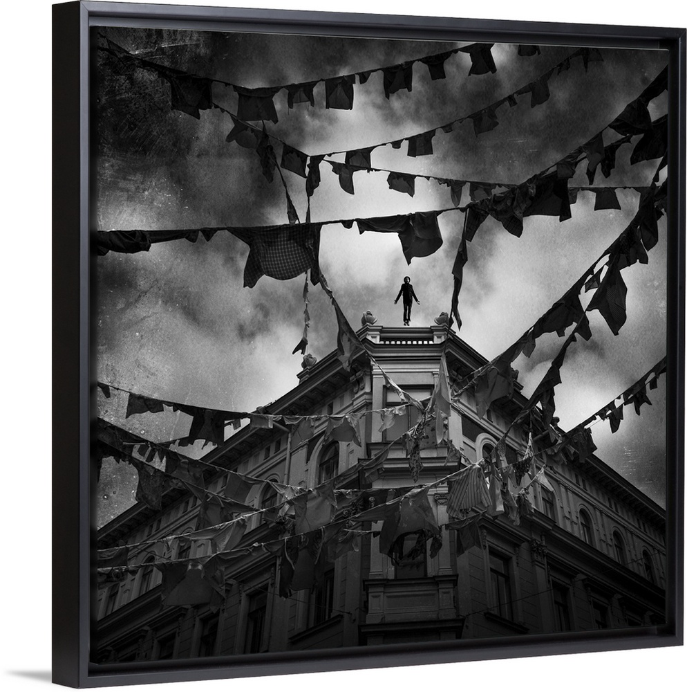 <p>Conceptual image of young adult male falling from tall building with clothes hung from bunting across street</p>