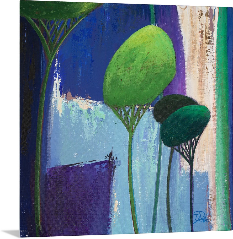 <p>A contemporary painting of abstract trees on a blue layered background.</p>