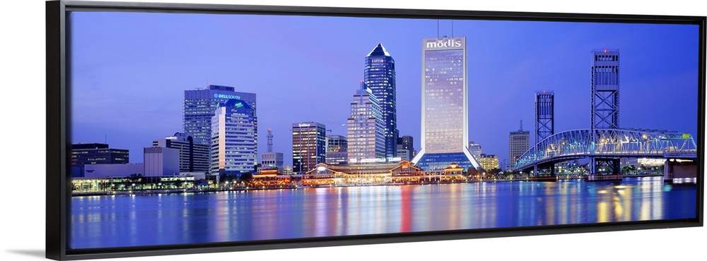 <p>This large panoramic photograph is of the Jacksonville skyline with it's buildings lit up at night and reflecting in the water in front of them.</p>