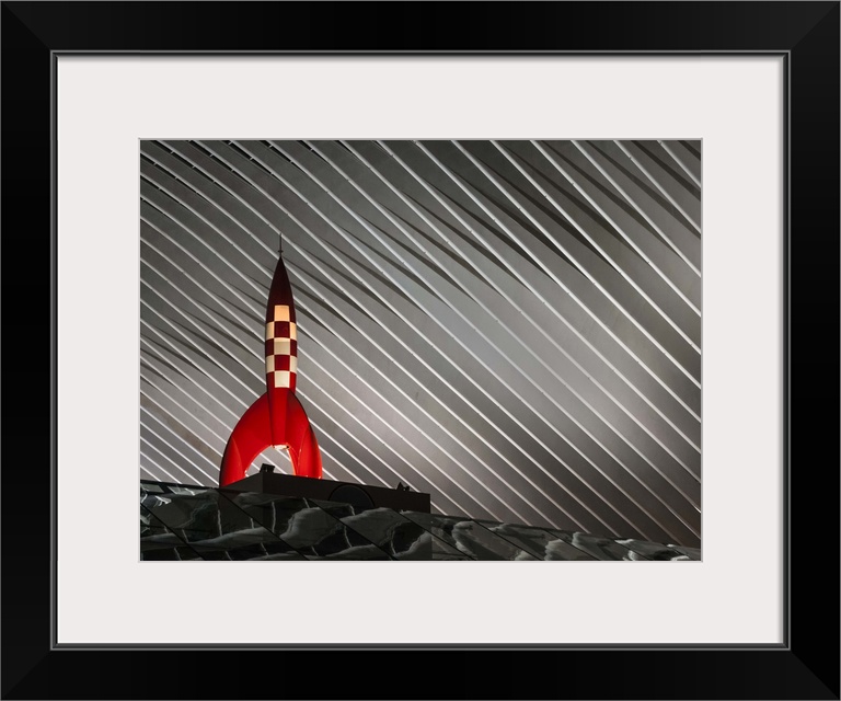 <p>Sculpture of Tintin's rocket from the book series by Herge, illuminated from below.</p>