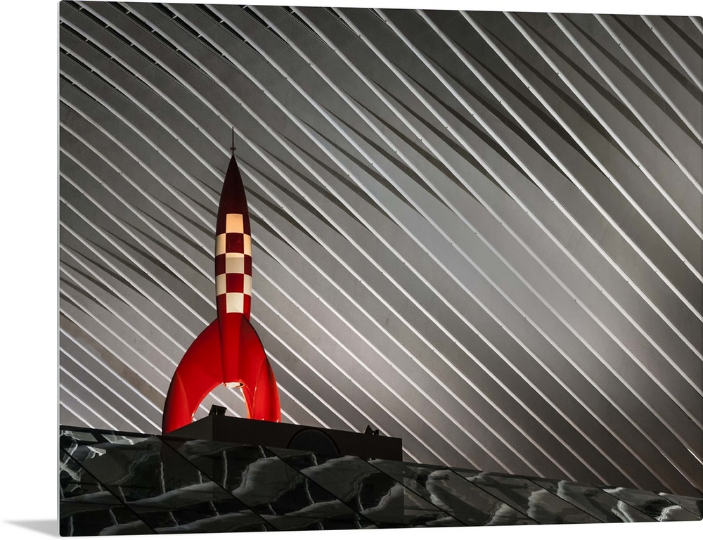 <p>Sculpture of Tintin's rocket from the book series by Herge, illuminated from below.</p>
