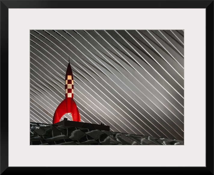 <p>Sculpture of Tintin's rocket from the book series by Herge, illuminated from below.</p>