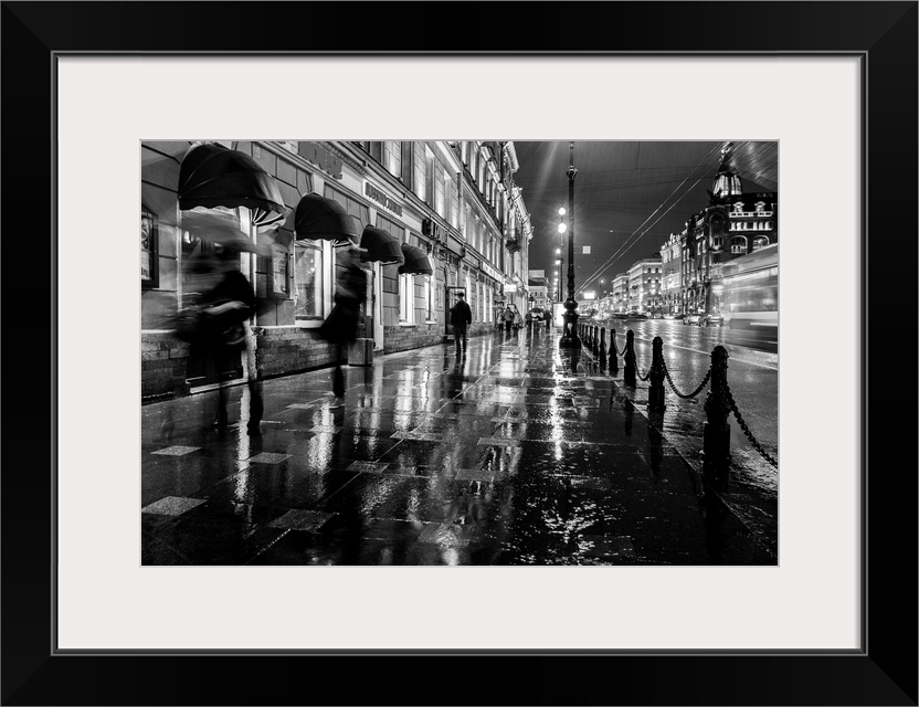 <p>People walking on a sidewalk in the city at night, trying to get out of the rain.</p>