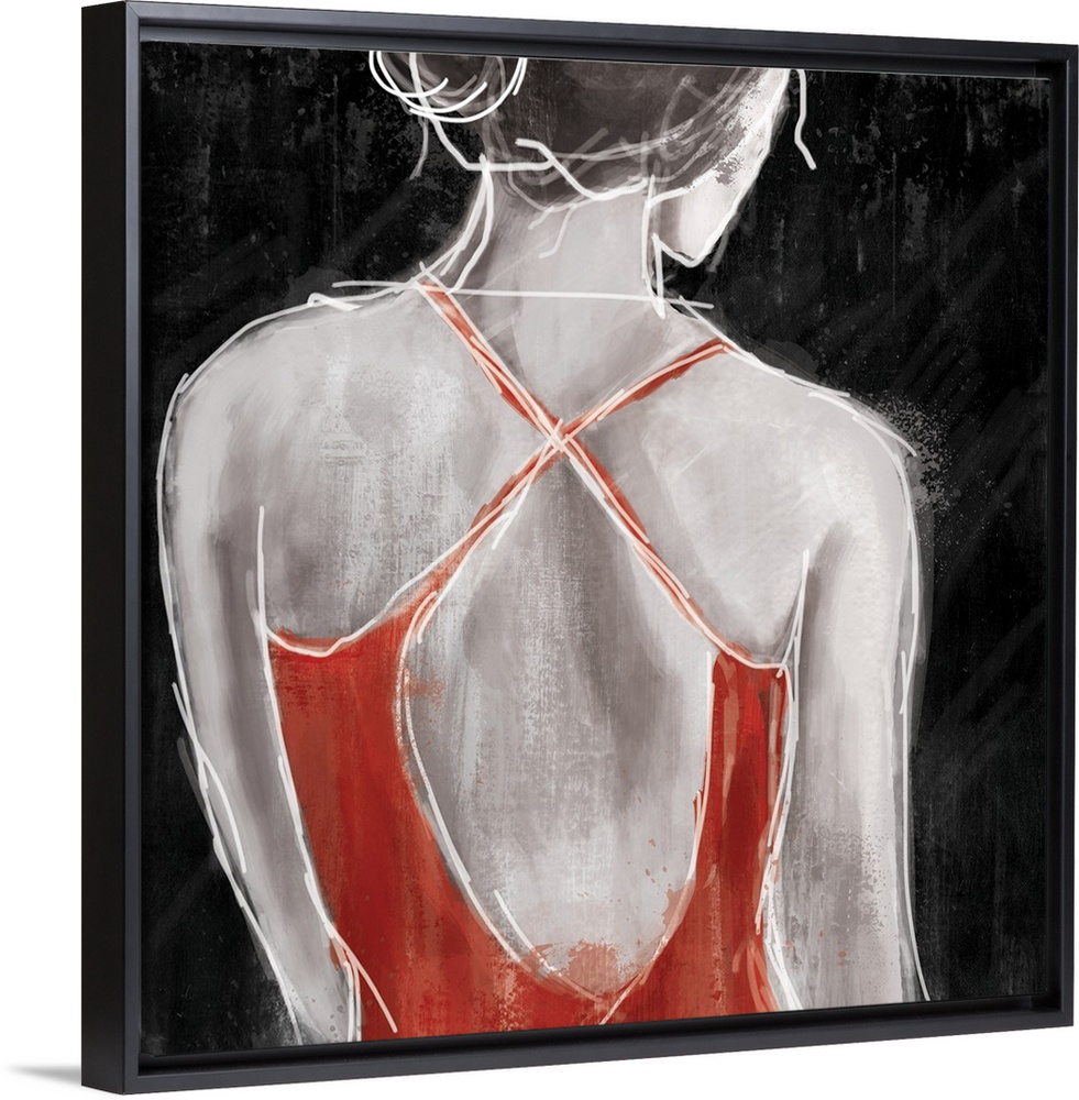 <p>Contemporary artwork of a woman wearing a red dress turned away from viewer.</p>