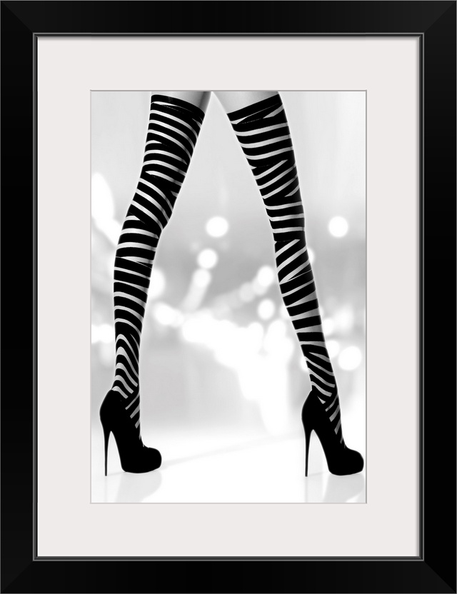 <p>Black and white photograph of a woman's long legs with black high heels and striped stalkings.</p>