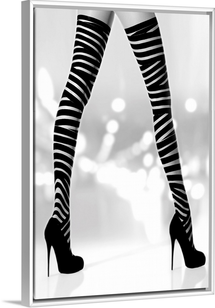 <p>Black and white photograph of a woman's long legs with black high heels and striped stalkings.</p>