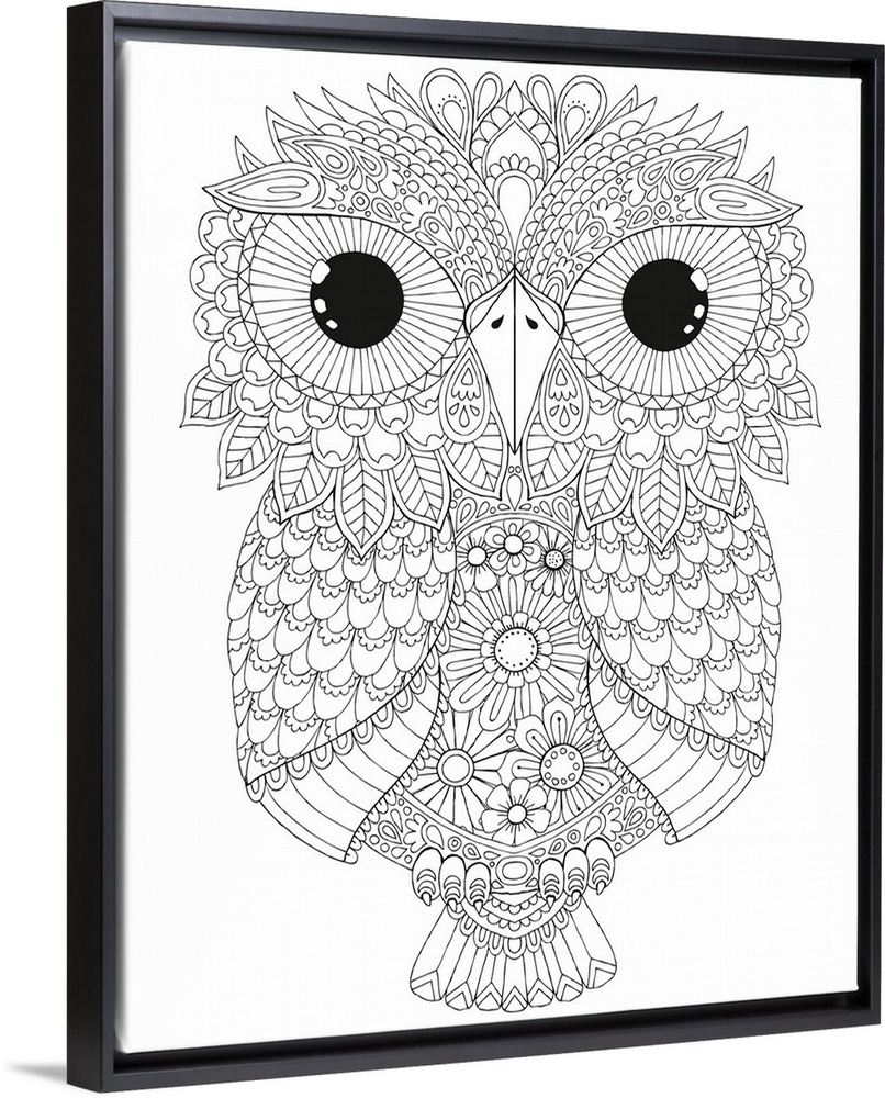 <p>Black and white line art of an intricately designed owl with big eyes.</p>
