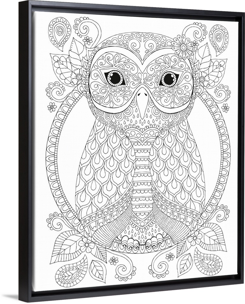 <p>Black and white line art of an intricately designed owl perched inside a circular ring with leaf designs around it.</p>