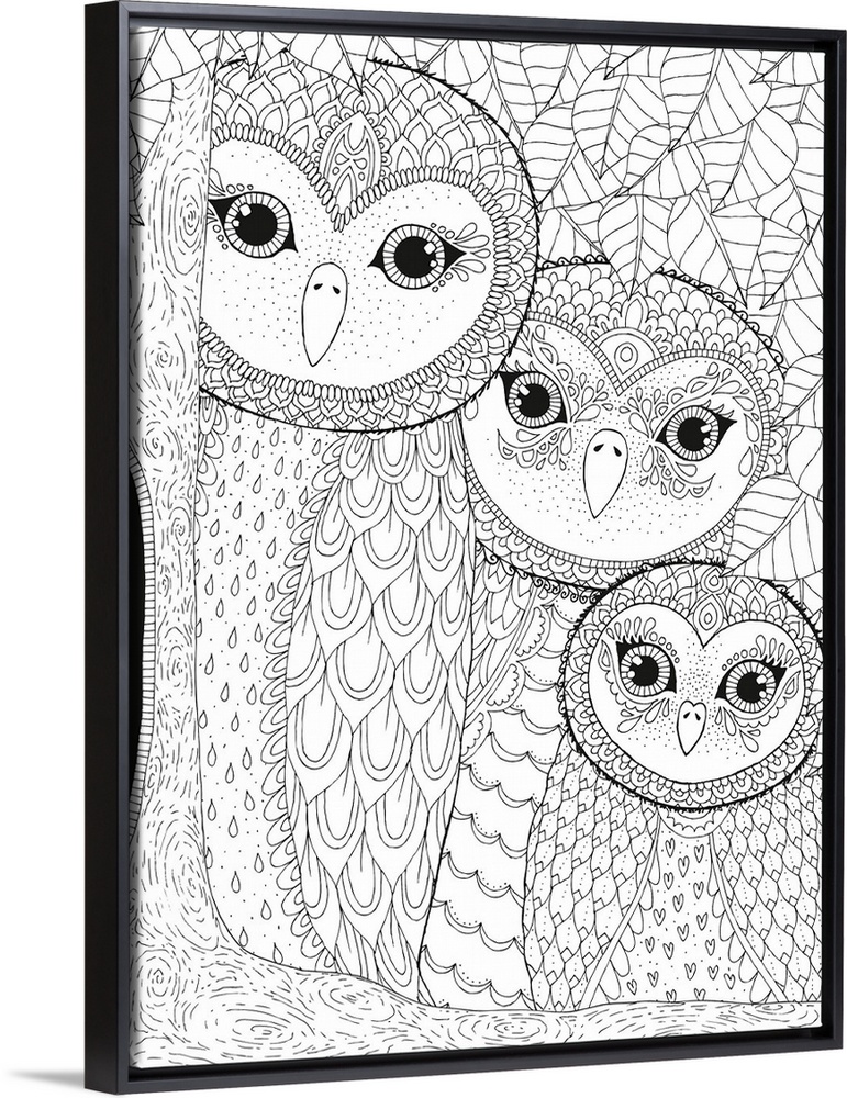 <p>Black and white line art of a family of owls in a tree with a leafy background.</p>