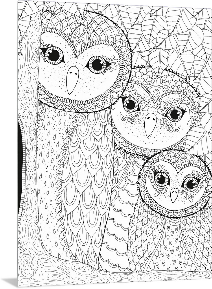 <p>Black and white line art of a family of owls in a tree with a leafy background.</p>