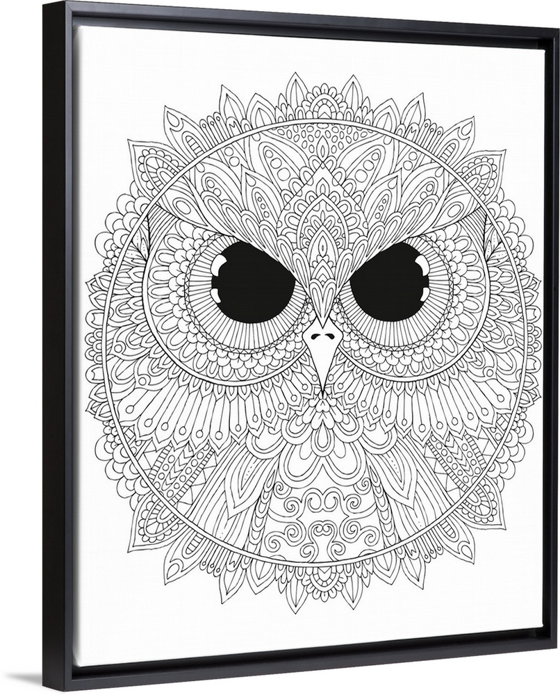 <p>Black and white line art of a circular design with a close-up of an owl's face with big, black, fierce eyes in the center.</p>