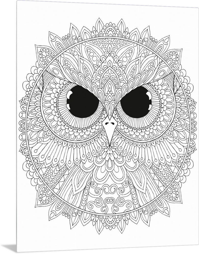 <p>Black and white line art of a circular design with a close-up of an owl's face with big, black, fierce eyes in the center.</p>