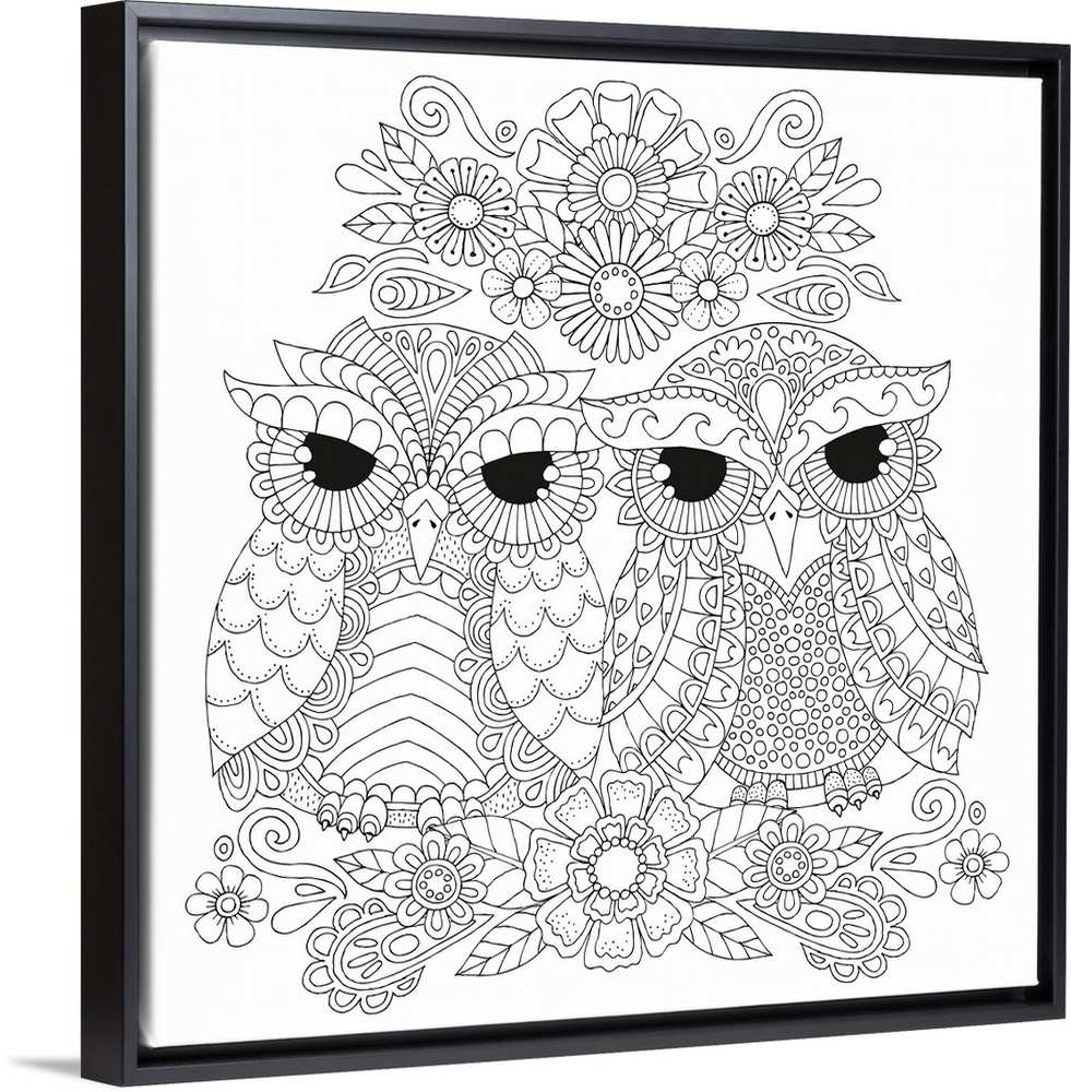 <p>Black and white line art of tow owls with dark black eyes surrounded by flowers.</p>