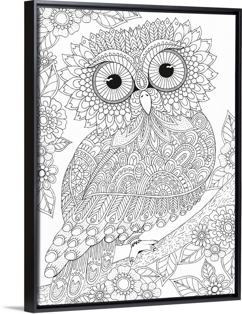 <p>Black and white line art of an intricately designed owl with big eyes perched on a branch and surrounded by flowers.</p>