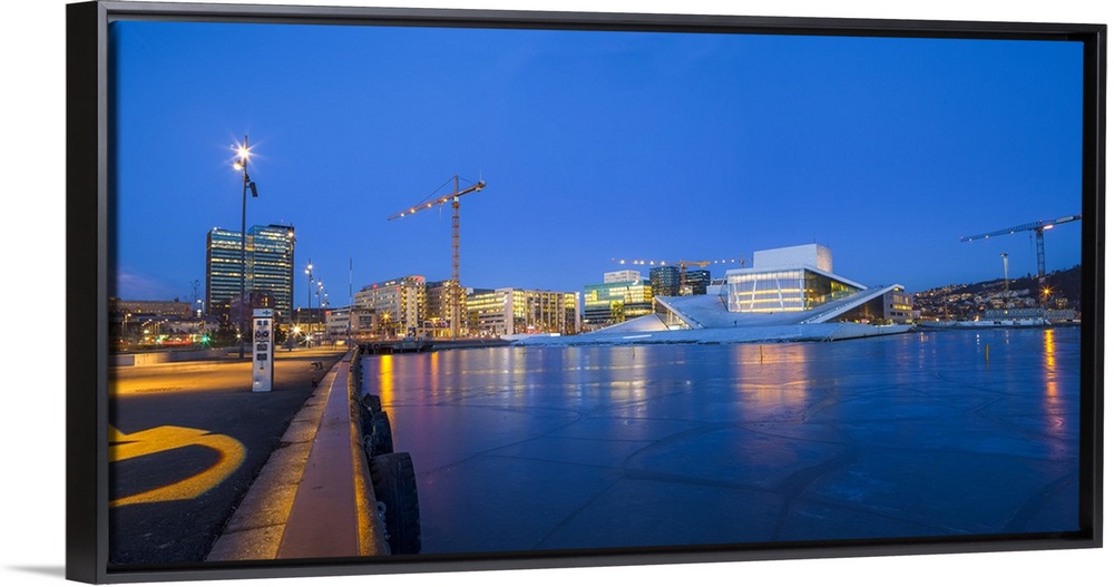 <p>Night panoramic view of the Oslo Opera House, frozen bay and new business quarter, Oslo, Norway, Scandinavia</p>