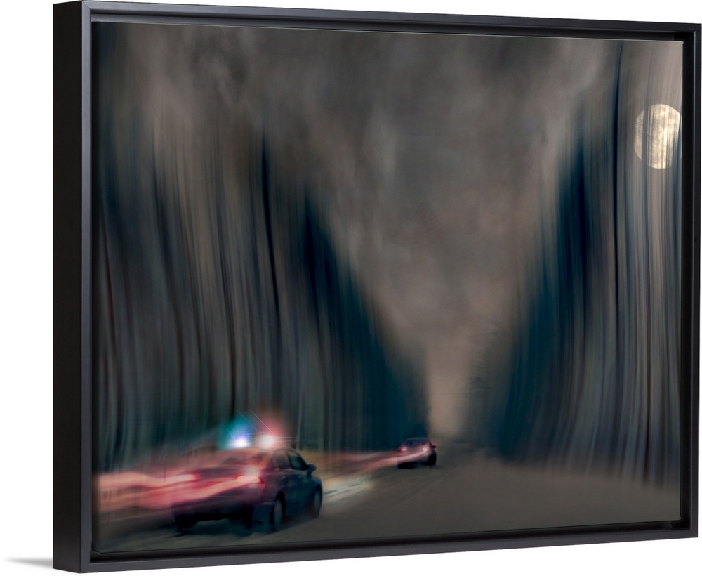 <p>Blurred motion image of a police car chasing a speeding vehicle.</p>