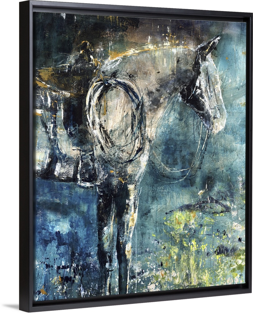 <p>Contemporary painting of a profile of a horse wearing a saddle and reins.</p>