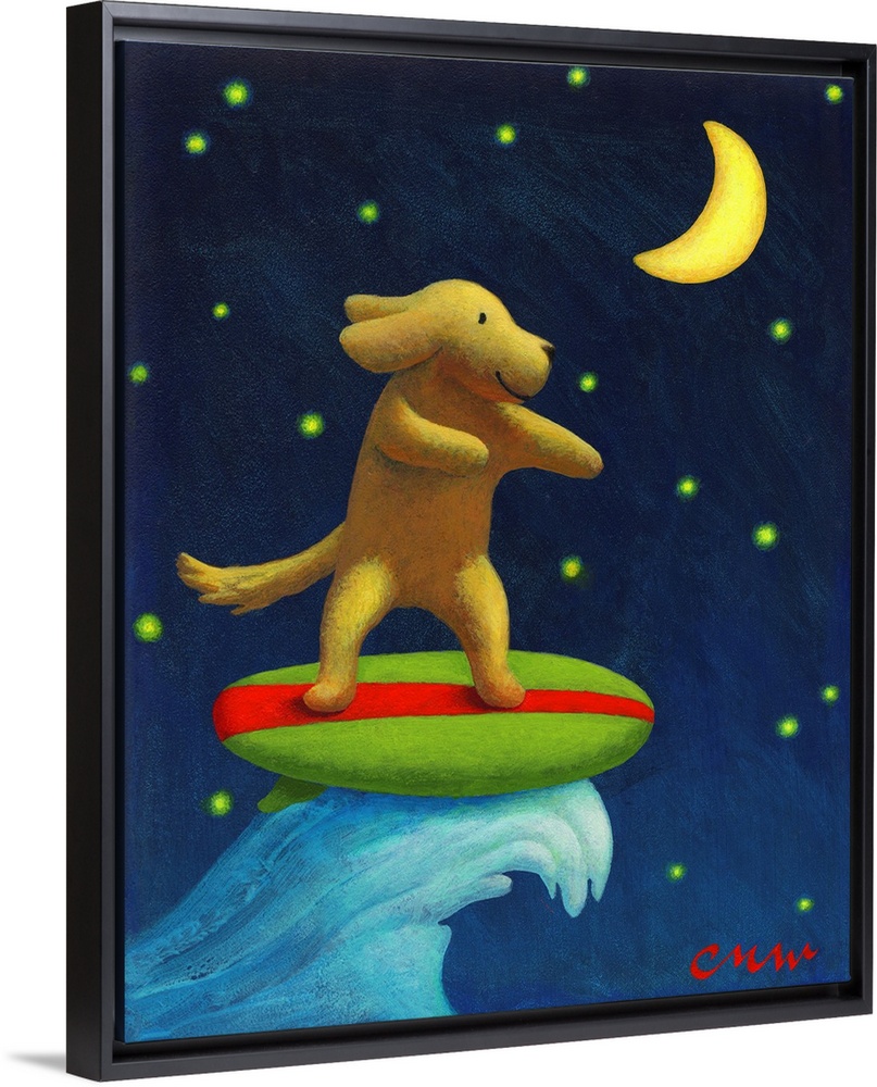 <p>Contemporary painting of a dog surfing with the night sky in the background.</p>